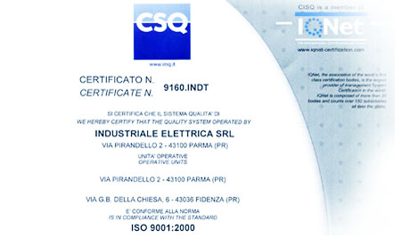The Industriale Elettrica s.r.l. quality assurance system is in compliance with the UNI EN ISO 9001:2000 standard. The CSQ certification is recognized worldwide through the IQNet and is considered the most qualified within the industrial electrical sector.